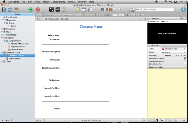 I prefer the simplicity of this document — I can fill this out in 20 minutes or less and get back to writing. My favorite part of this document, however, is that I can drag and drop a picture to remind me of what the character looks like!