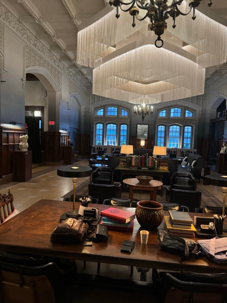 I’m at the Hotel Kansas City grabbing some breakfast and writing time before my next intern. I have a rose-lavender latte with me and am waiting for breakfast. The whole place has a private club vibe — as it should, because it used to be a private club. In its heyday, I would never have been allowed in, because private clubs were men’s only. The whole place smells of the fireplace in the restaurant.