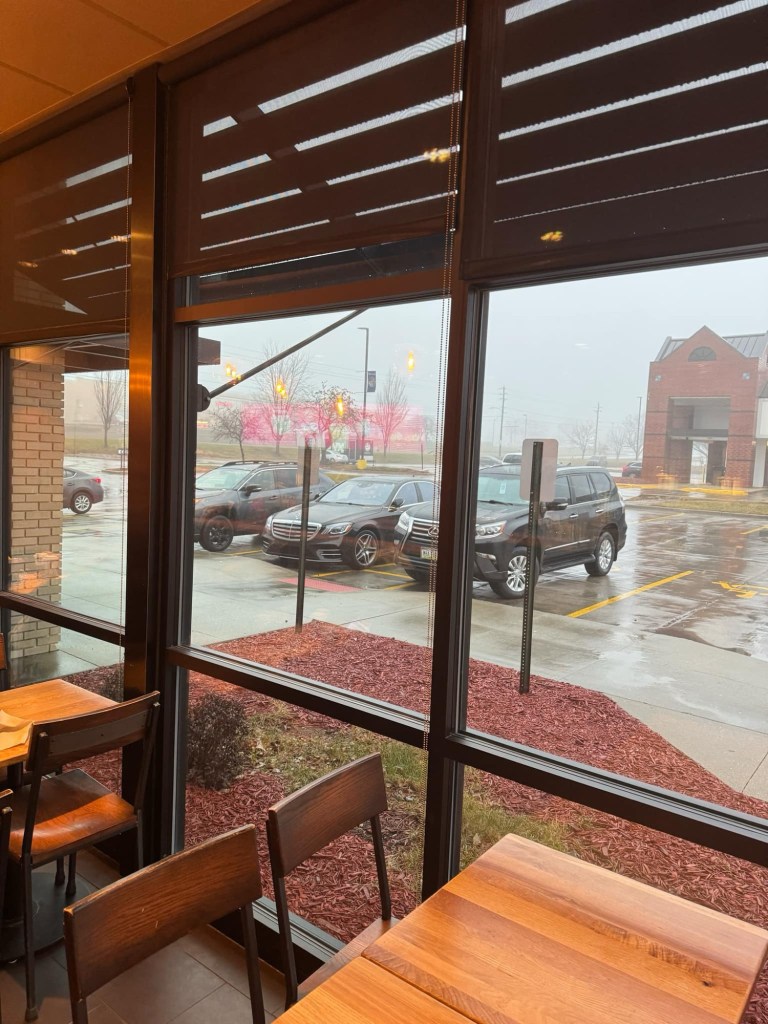 We decided to stay in Des Moines overnight to break the trip back into a couple of days. Des Moines is a comfortable big city; I could live here. Richard, on the other hand, is worried about the snowy weather, which we are not having right now. It’s 46 degrees out and perpetually rainy. We’re waiting out the dense fog advisory south of us, so we’re at a Starbucks so I can write.