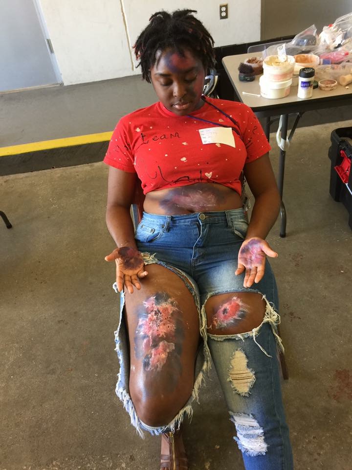 My job is to create realism. I’m the coordinator of the Moulage crew, and my crew supplies realism through simulated injuries and illnesses. We go for as much medical realism as we can produce with stage makeup and fake blood. None of our trainees have vomited yet, but we once sent someone to a hospital for a drill and he was seconds away from getting an IV.