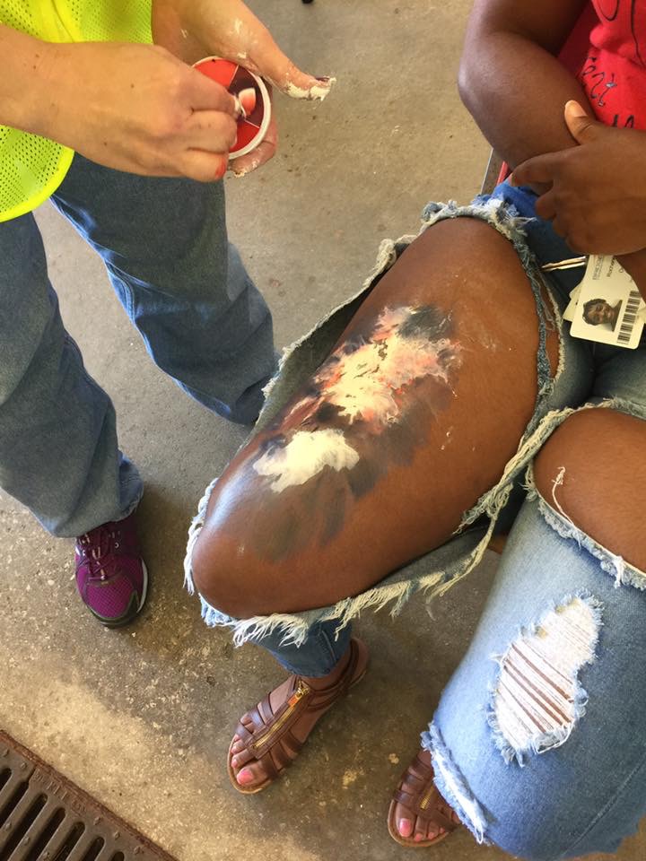 Moulage is one of my favorite creative outlets. My husband and I have a little competition as to who’s grossing out people the most realistically. His specialty is degloving injuries, mine is deep burns. We learn from the nurses, medics, and zombie aficionados we encounter on our crews. And it’s worth sleeping on the floor and eating the Atlantican national dish, rice and beans, for four days.