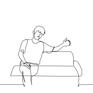 man sits as if hugging the person sitting next to him, but no one is visible – one line art vector. concept imaginary friend