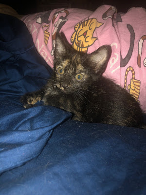 My husband and I have just had coffee and breakfast, and we are both sprawled on the bed (fully clothed). I am typing this entry on my computer while Chloe the kitten tries to climb up my lap desk, and Richard the husband surfs on his phone. Outside, the dark sky and occasional thunder sets a cozy mood.