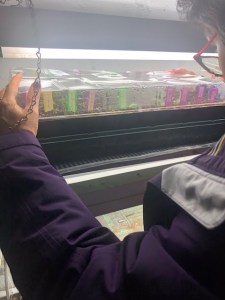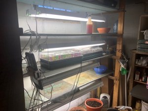 The wires are for all the fluorescent fixtures and the heat pads — and the ancient iPad repurposed for record keeping that you see at your left.  The wall that you can’t see is lined with reflective material that was meant to insulate a garage door. Peel and stick — excellent for increasing the light in this room.