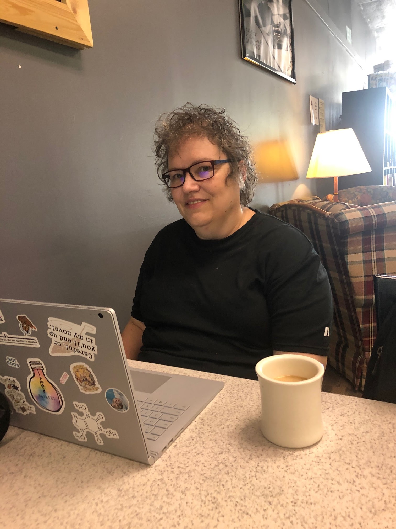 This is me at the local coffeehouse I’ve been talking about. I haven’t been going very fast with my writing — this novel just doesn’t want to be written.