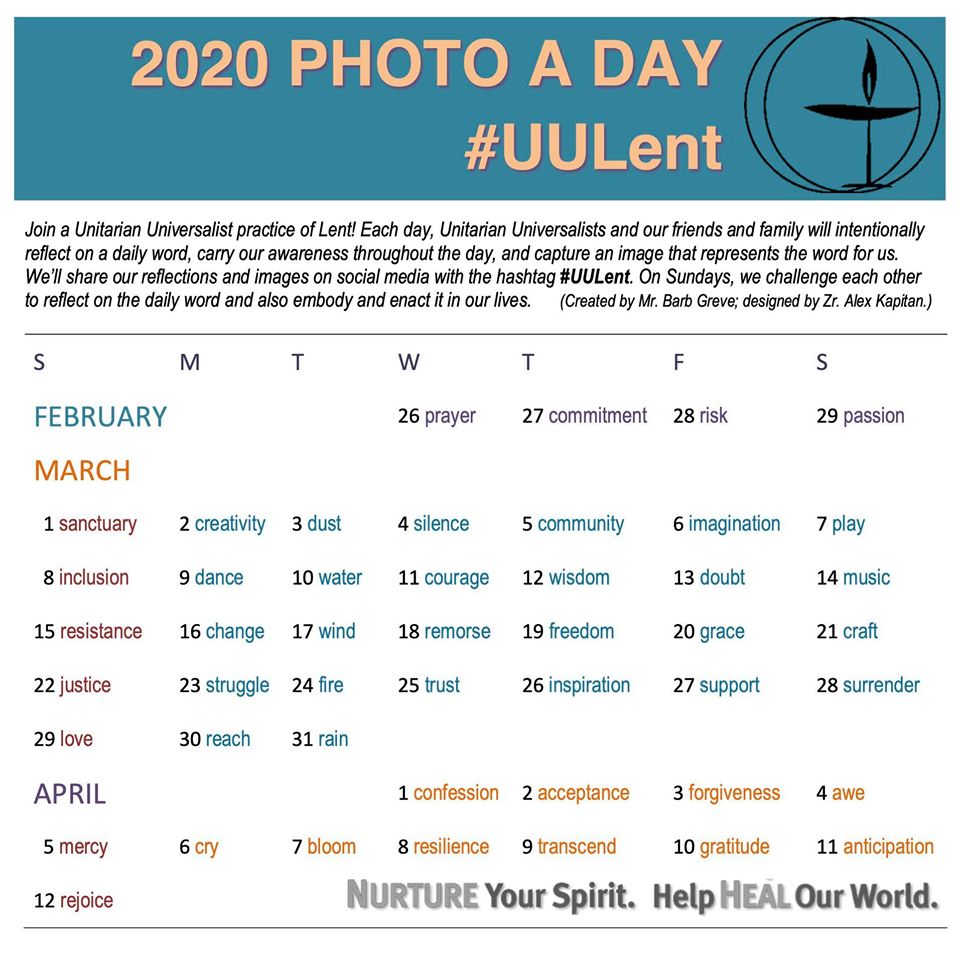 I will once again be doing #UULent reflections, even though I am not Unitarian Universalist and I’m not even sure I’m Christian these days given the bad name Evangelism/Fundamentalism are giving Christianity. I do like the concept of Lent as a period not of giving up but of growing up, and I feel like these prompts will help me focus on that outside of myself.